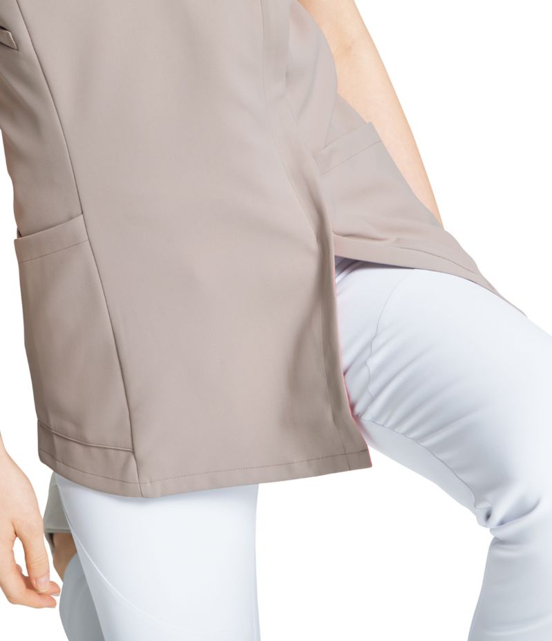 女性の肌を美しく魅せる、上品なカラー展開。ナースと女性を知り尽くしたフォークとワコールならではのバリエーション展開です。また、背面の裏地に花柄やヒョウ柄、ペイズリー柄の生地を使用。繊細なカッティングの襟元で女性らしさを表現した、おしゃれなデザインです。